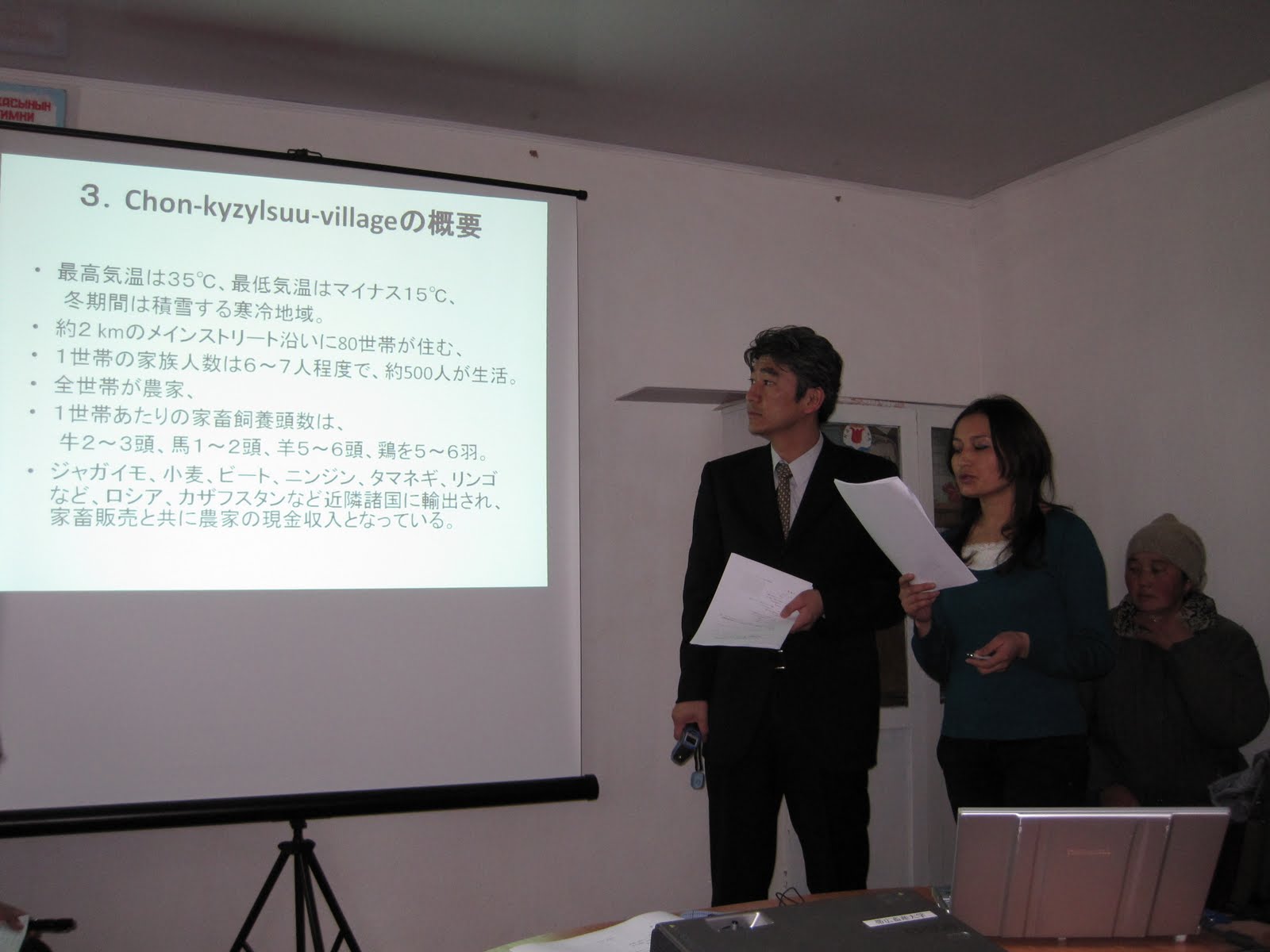 ※写真は、キルギスで行ったバイオガスワークショップ、調査概要を説明。